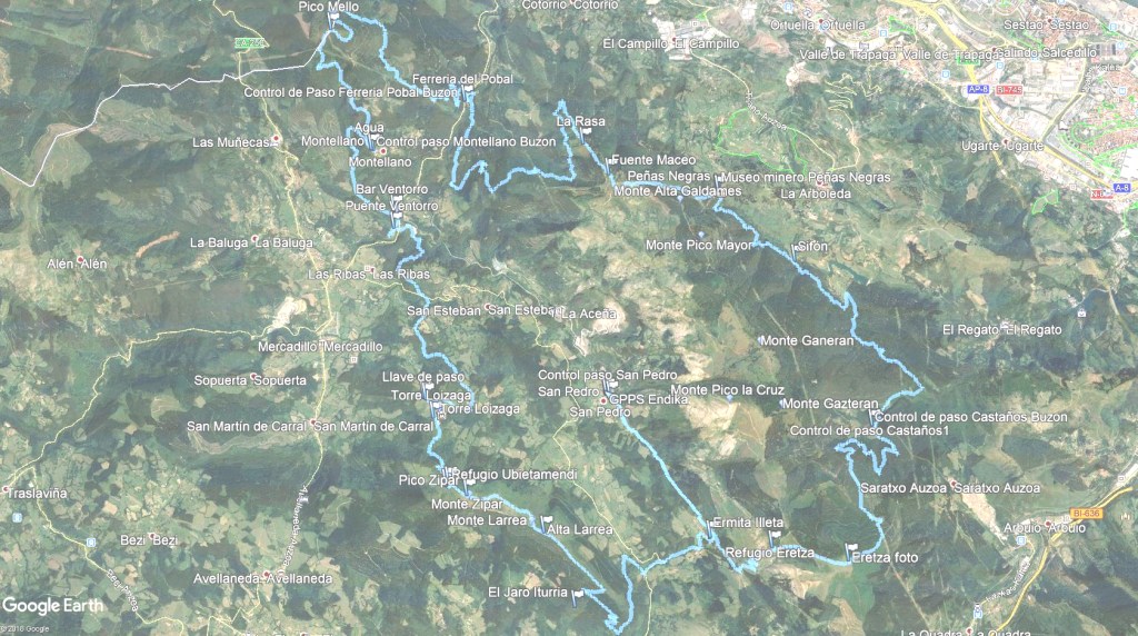 Recorrido de media montaña por el cresterío del Ganera, Mello y Ubieta, con una distancia de 60 km andando y 66 km en bicicleta de montaña, aproximadamente cuenta con un desnivel acumulado de 8400 metros. Desde el pueblo de San Pedro(170 m.) donde damos la salida y será la meta ascendemos por el barrio Illeta al Eretza, punto mas alto de la prueba, para bajar al B. Castaños cerca del antiguo pantano del Regato(Barakaldo). Bordearemos todo el cresterío el Grumeran para llegar al museo de la Minería del Txaparral para subir al antigúa barrio minero El Sauko ( Avituallamiento), pasaremos por la cresta de la Rasa para bajar a la zona mas baja de la prueba, La antigüa Ferrería del Pobal( paso de carretera). Ascendemos al Mello para luego pasar por el B. Montellano (avituallamiento), de donde descenderemos al Arenao para ir ascendiendo a la última cumbre, Monte Zipar, no sin pasar por la Torre Loizaga (museo de coches clásicos). Pasamos por el Alta Larrea y de alli descendemos a meta.